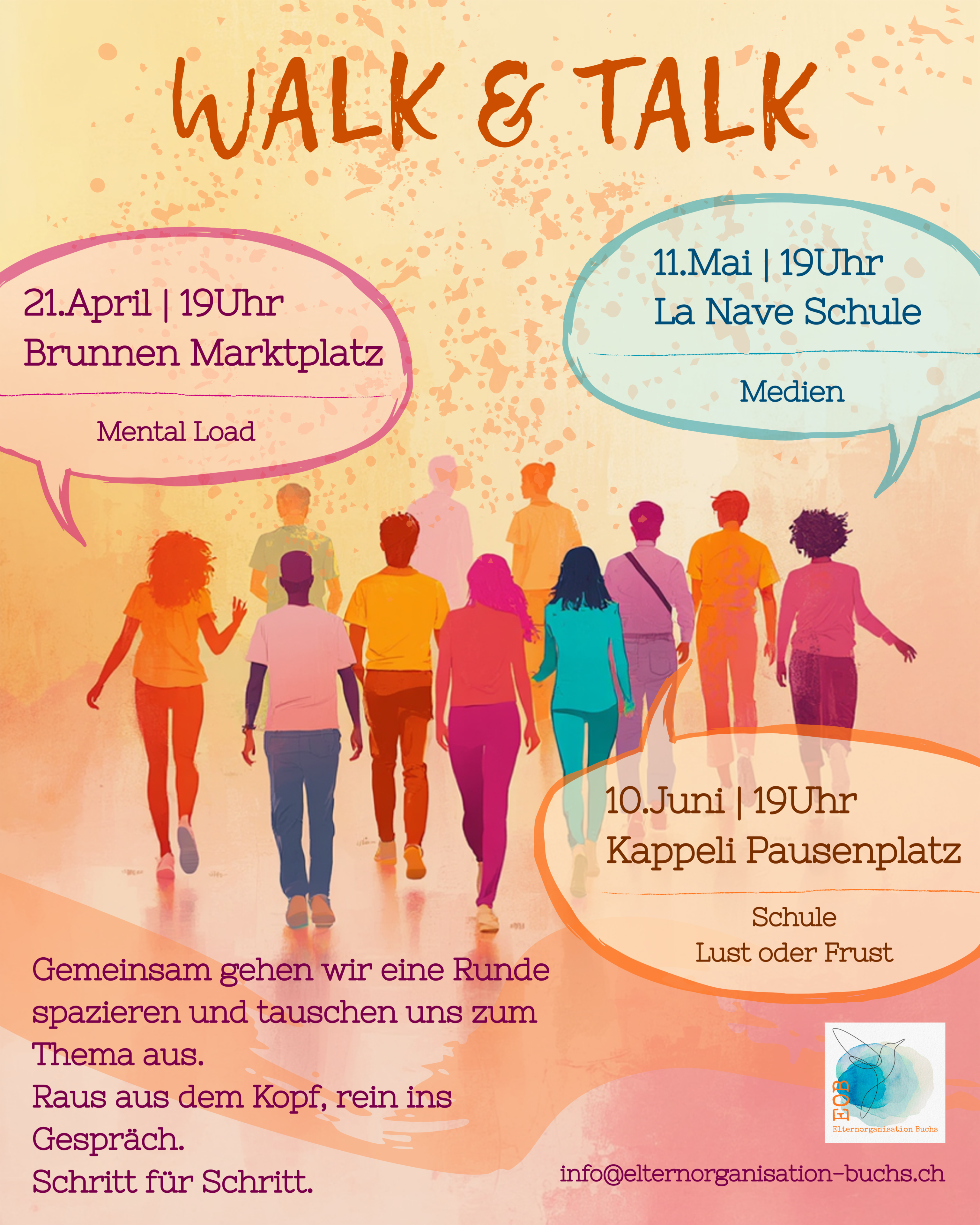 Alle kennen es, die Gedanken um gewisse Themen drehen sich im Kopf, man fragt sich, ob man damit allein ist oder ob es anderen auch so geht… Wir möchten uns deshalb gern zu den aufgeführten Themen austauschen, und manchmal klappt das mit Bewegung wie von selbst. Bisch debii?